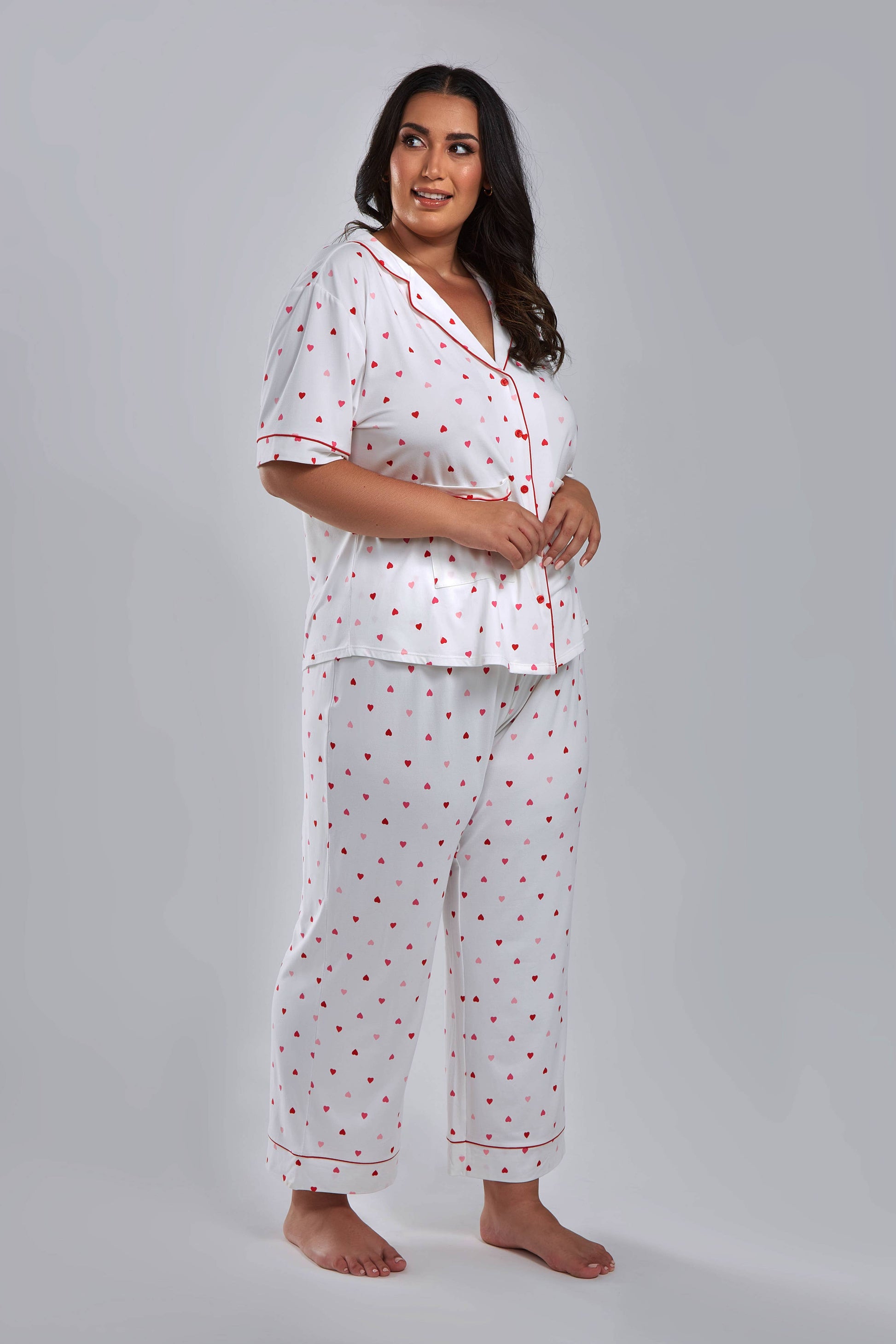 Cozy up in our soft sweetheart pajama pant set. Our Top is true to size and relaxed with contrast red piping on the placket, collar, front pockets, sleeves and pant hem. Soft and comfortable to sleep-lounge in all day. Designed in a viscose and spandex blend. Machine Wash cold and gentle. Ok to tumble dry in low heat.