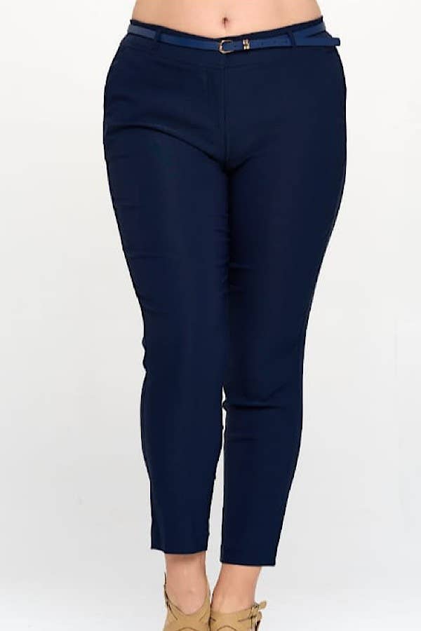 PLUS SIZE MILLENIUM TROUSERS WITH BELT. (BURGUNDY AND NAVY PANTS HAVE MATCHING COLOR BELTS). 76% RAYON, 21% NYLON, 3% SPANDEX