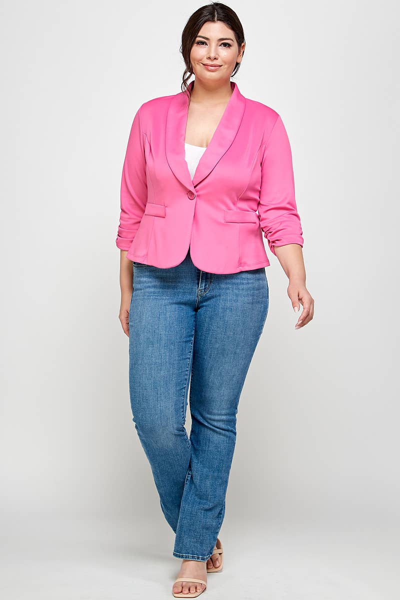 Plus size, solid shawl collar blazer, with one button closure, faux pockets, and ruched 3/4 sleeves, by Haute Fox
