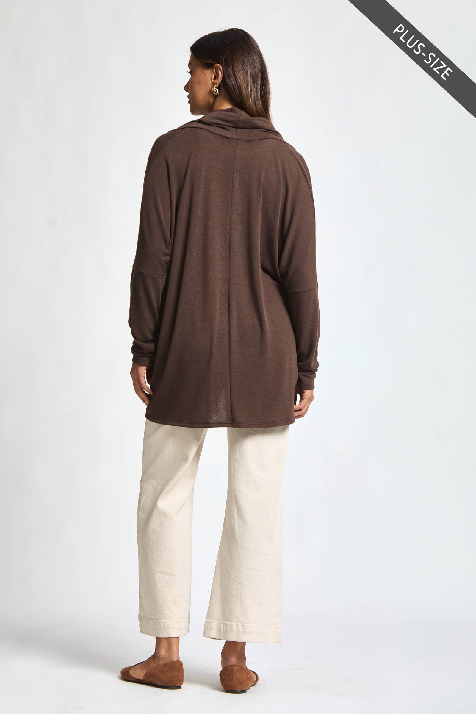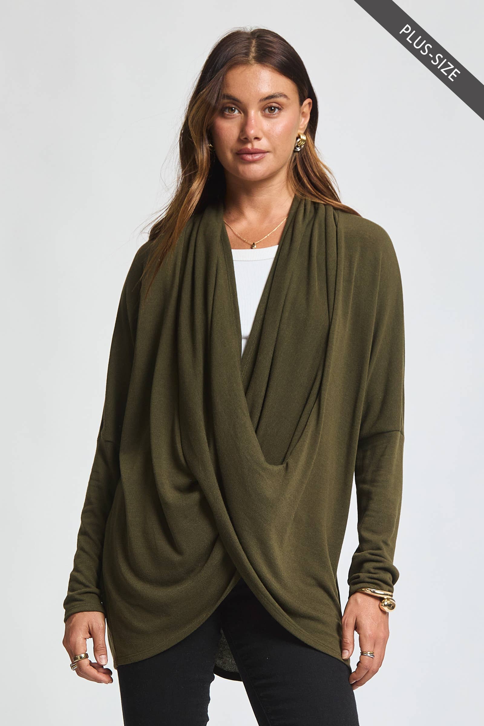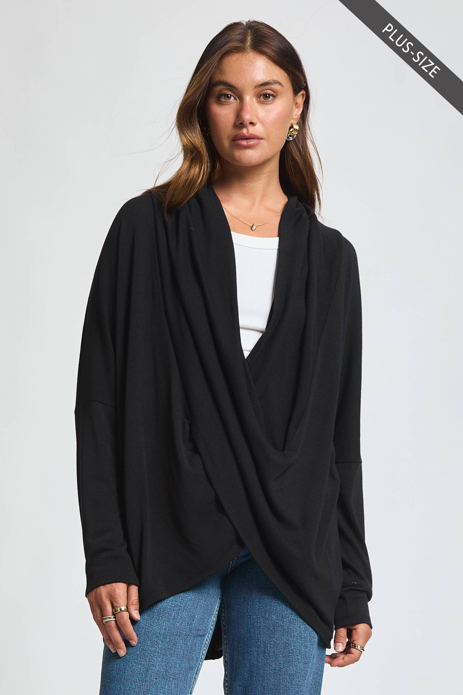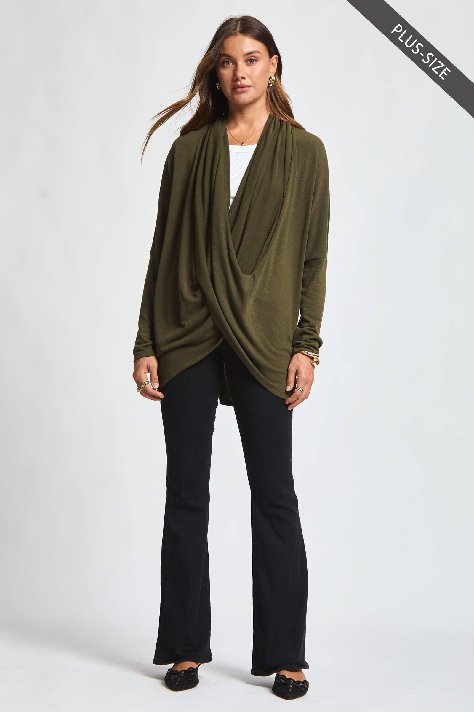This beautiful hacci wrap top is perfect for transitional days! We love the easy fit on this top with long sleeves and detailed front. Stretchy, knit.
